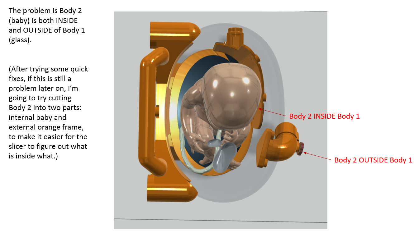 The repair of the baby body in GrabCAD might have fixed it, but if not, the answer would be to go back to the software that generated the baby and make sure it is watertight there. There is also the possibility for you to do a forced boolean of baby and clear shell, as a last resort.