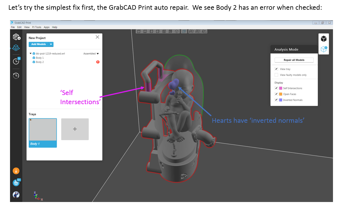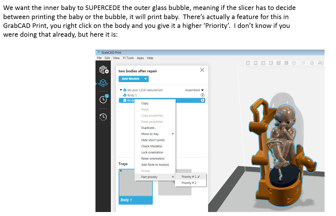 Just sent back a reply, with pictures. I think the fix is two-fold: use the auto repair tool in GrabCAD Print to get rid of small model errors (which cause the slicer to not know where the inside is), and use 'Part Priority' to make sure the baby prints instead of the clear shell. Look over the two emails I've sent, and let me know how it goes!