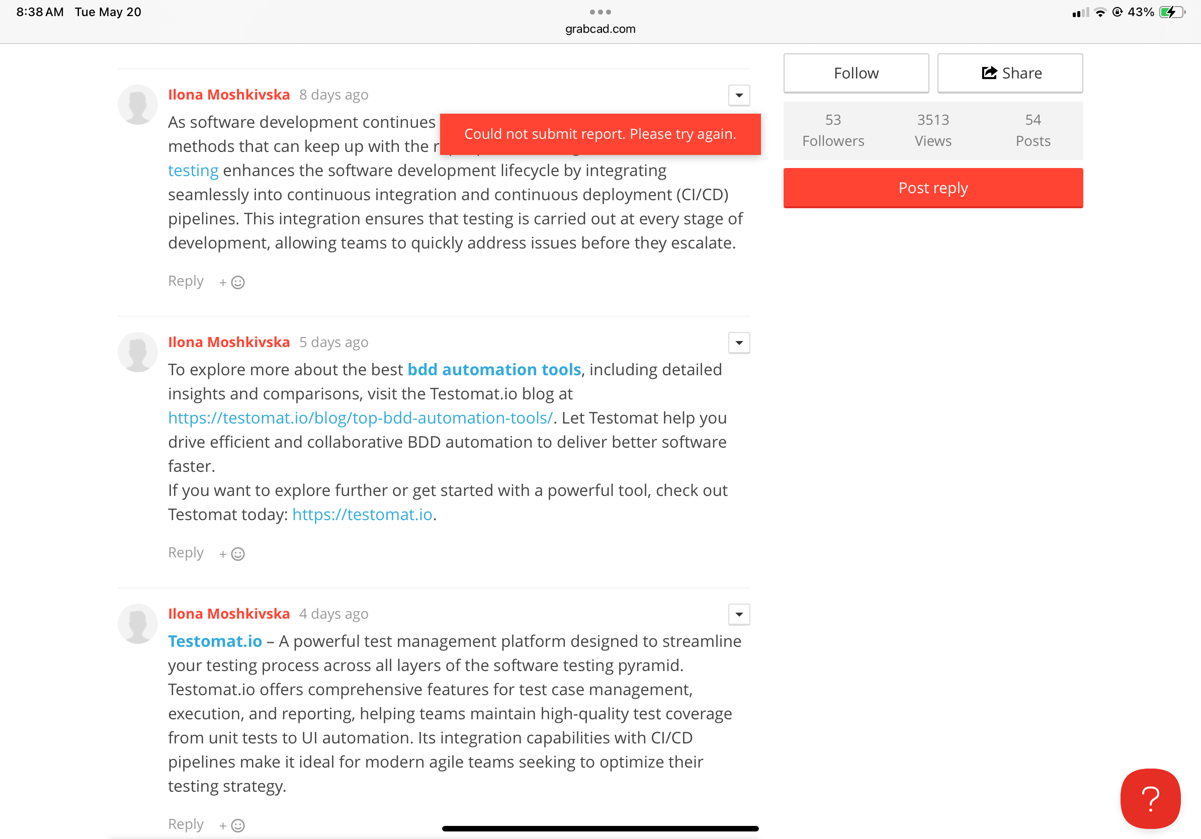 Bob Wiley 20 May, 2025 01:44 PM Cannot submit reports on spam posts nor on spamming users. Just get a pop up that says “Could not submit report. please try again.”