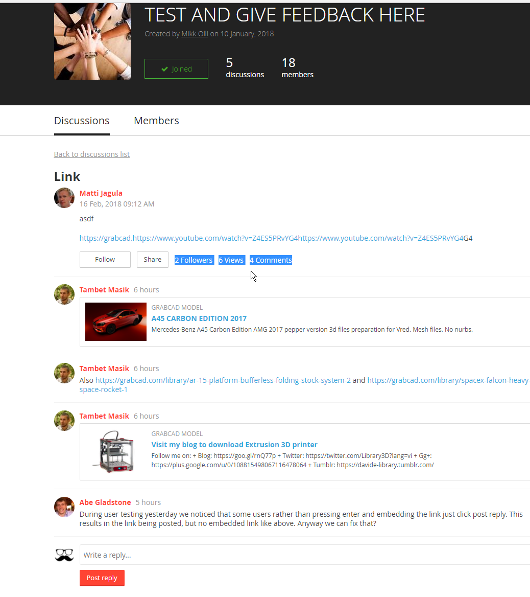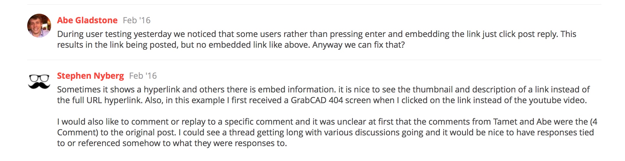 Sometimes it shows a hyperlink and others there is embed information. it is nice to see the thumbnail and description of a link instead of the full URL hyperlink. Also, in this example I first received a GrabCAD 404 screen when I clicked on the link instead of the youtube video.