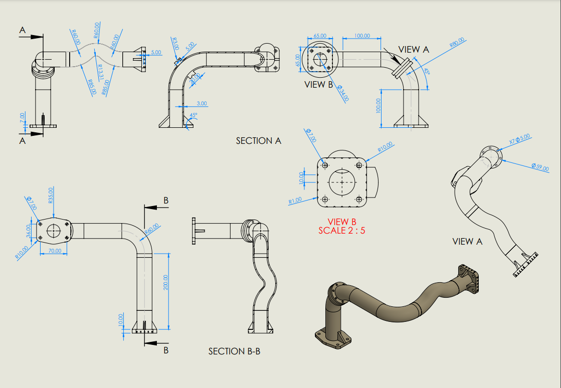 Here you go. Some of the dimensions (like the part where the pipe waves) are underdefined, so I made assumptions.