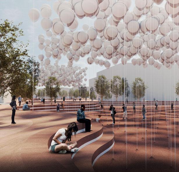 solarCLOUD looks like sunflowers trigger by the sun, it’s an artistic installation of solar balloons that would rise using the sun’s energy and capture more light to generate electric energy. These solar balloons also trigger the roller for mechanical energy, thus, creating endless variational, moving cloud that provides shade underneath.