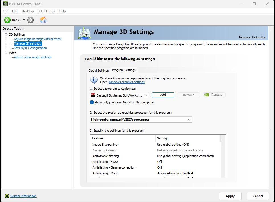 Sometimes, background apps or Windows power settings can throttle GPU performance. Switching to High Performance mode in Windows can make a noticeable difference. It’s a good idea to monitor GPU utilization using tools like MSI Afterburner or Task Manager to see if SolidWorks is offloading any tasks to the CPU unnecessarily.